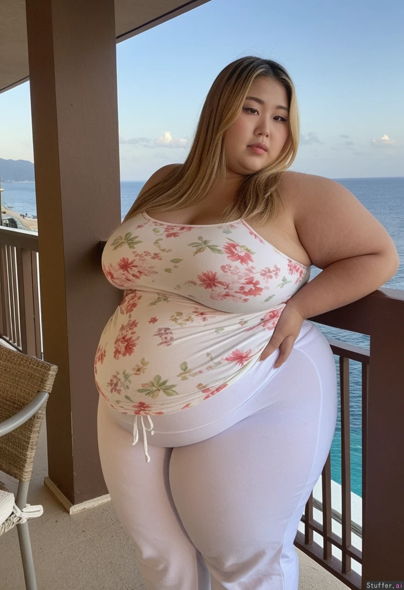 20 year old beautiful Korean girl, hair dyed with blonde highlights, (((wearing big summer top and pants))) (((Wide hips))) Huge fat blob Obese SSBBW Plump fat arms Overweight (Fat_belly) Plump Full body view Beautiful lighting On resort balcony overlooking sea