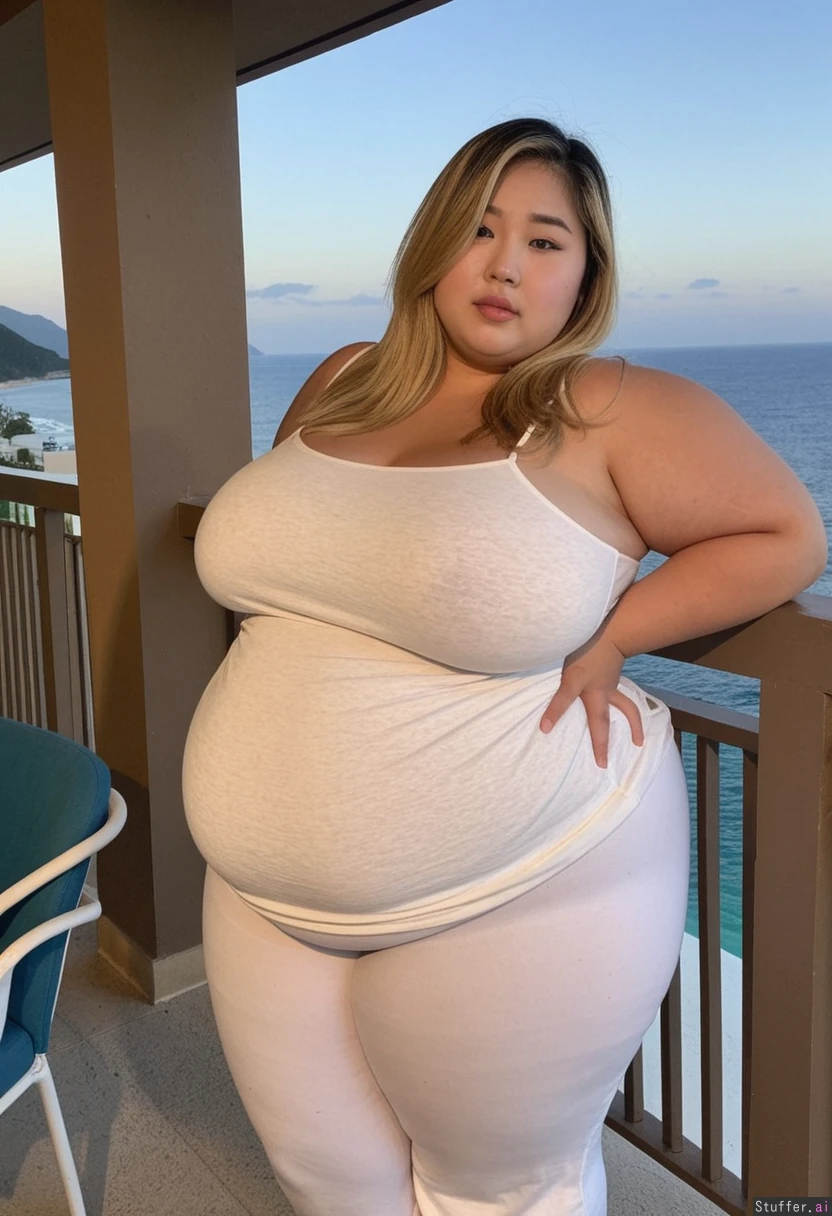 20 year old beautiful Korean girl, hair dyed with blonde highlights, (((wearing big summer top and pants))) (((Wide hips))) (Huge fat blob) (Obese) BBW (Plump fat arms) Overweight (Fat_belly) Plump Full body view Beautiful lighting On resort balcony overlooking sea