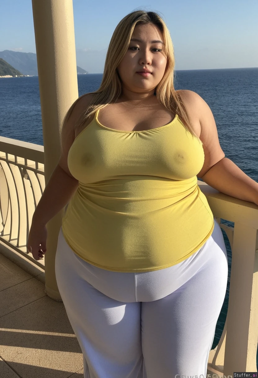 20 year old beautiful Korean girl, hair dyed with blonde highlights, (((wearing big summer top and pants))) (((Wide hips))) (Huge fat blob) (Obese) SSBBW (Plump fat arms) Overweight (Fat_belly) Plump Full body view Beautiful lighting On resort balcony overlooking sea