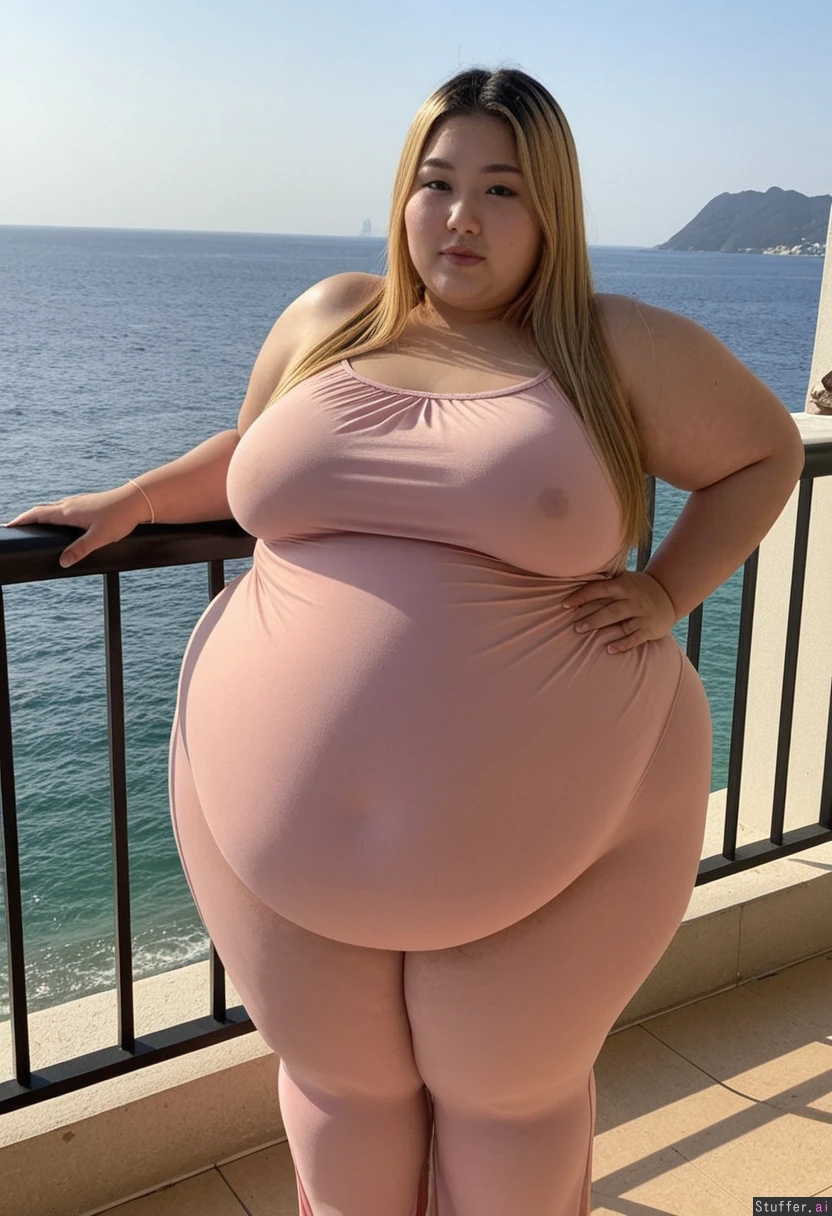 20 year old beautiful Korean girl, hair dyed with blonde highlights, (((wearing big summer top and pants))) (((Wide hips))) (Huge fat blob) (Obese) SSBBW (Plump fat arms) Overweight (Fat_belly) Plump Full body view Beautiful lighting On resort balcony overlooking sea