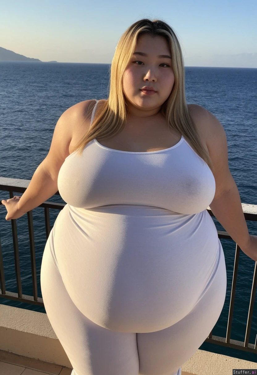 20 year old beautiful Korean girl, hair dyed with blonde highlights, (((wearing big summer top and pants))) (((Wide hips))) Huge fat blob Obese SSBBW Plump fat arms Overweight (Fat_belly) Plump Full body view Beautiful lighting On resort balcony overlooking sea