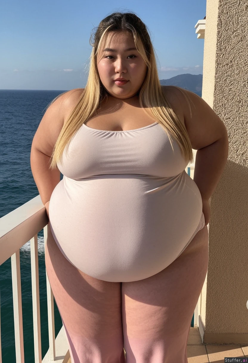 20 year old beautiful Korean girl, hair dyed with blonde highlights, (((wearing big summer top and pants))) (((Wide hips))) Huge fat blob Obese SSBBW Plump fat arms Overweight (Fat_belly) Plump Full body view Beautiful lighting On resort balcony overlooking sea