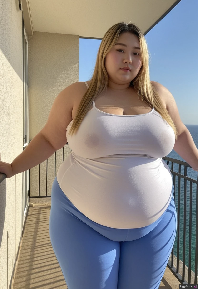 20 year old extremely beautiful Korean girl, blonde highlights ((wearing big summer top and pants)) (((Wide hips))) (Fat_belly) Huge fat blob Plump fat arms BBW Obese Overweight Plump Beautiful lighting On balcony overlooking sea
