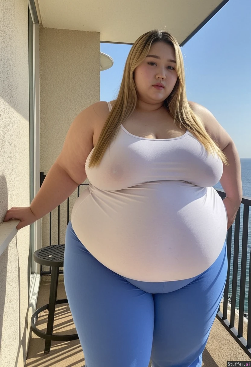 20 year old extremely beautiful Korean girl, blonde highlights ((wearing big summer top and pants)) (((Wide hips))) SSBBW (Fat_belly) (Huge fat blob) Plump fat arms BBW (Obese) Overweight (Plump) Beautiful lighting On balcony overlooking sea
