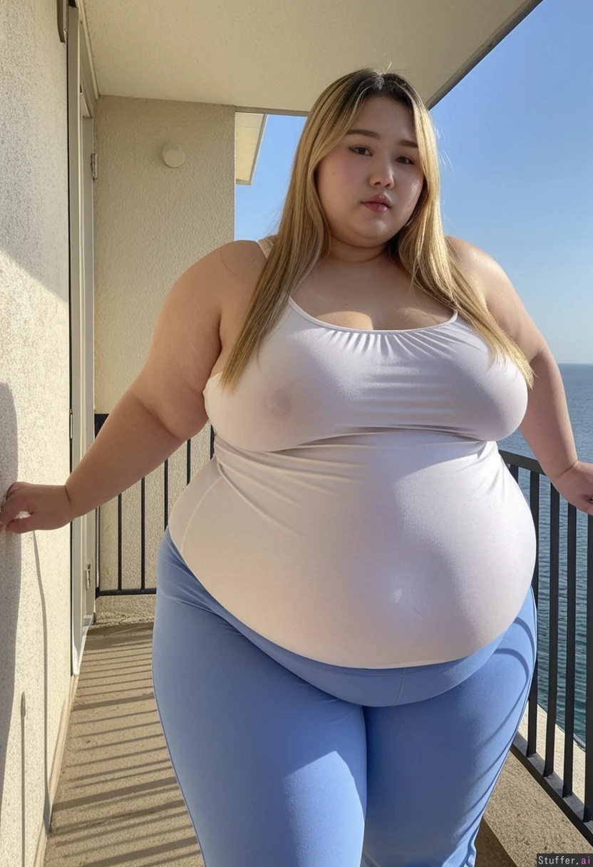20 year old extremely beautiful Korean girl, blonde highlights ((wearing big summer top and pants)) (((Wide hips))) SSBBW (Fat_belly) Huge fat blob Plump fat arms BBW (Obese) Overweight (Plump) Beautiful lighting On balcony overlooking sea