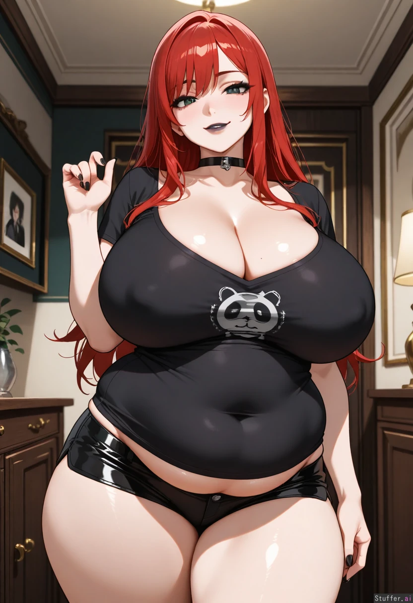 (exquisite quality, extremely detailed, realistic anime style, masterpiece, absurdres, solo, one girl). A sexy chubby goth girl flirting with viewer. Flirtatious smirk. Playful eyes. Seductive face. Blocking viewer. At a party. Wearing a black t-shirt with deep cleavage. Wearing black leather short-shorts. Goth outfit. (Goth makeup, black lips, black eyeliner). Hedonistic. 30 years old. Beautiful long red hair, beautiful dark-green eyes. Bewitching beauty. Cheerful house party, living-room background. (Chubby, bloated, smooth gigantic belly bulge, prominent round fat belly, fat belly kink, fat belly fetish, hyper-belly, belly peek)