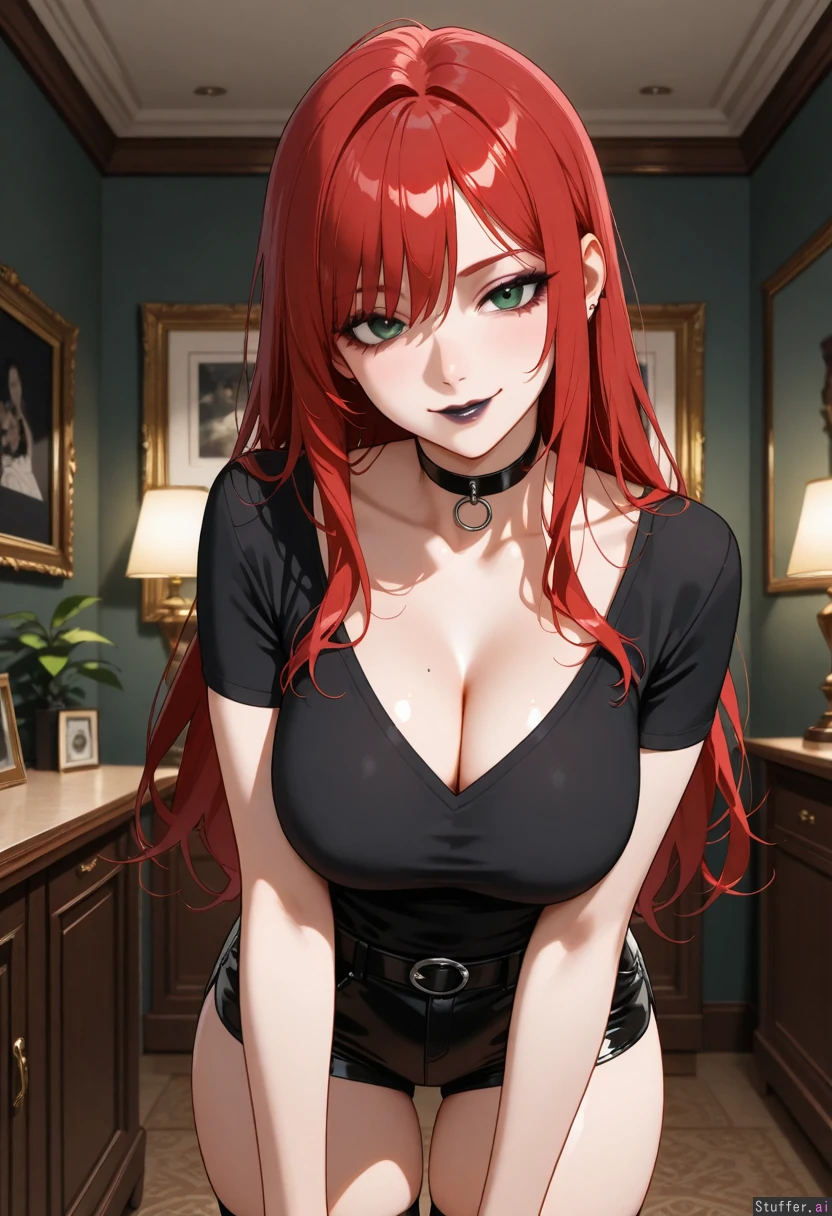 (exquisite quality, extremely detailed, realistic anime style, masterpiece, absurdres, solo, one girl). A sexy goth girl flirting with viewer. Flirtatious smirk. Playful eyes. Seductive face. Blocking viewer. At a party. Wearing a black t-shirt with deep cleavage. Wearing black leather short-shorts. Goth outfit. (Goth makeup, black lips, black eyeliner). Hedonistic. 30 years old. Beautiful long red hair, beautiful dark-green eyes. Bewitching beauty. Cheerful house party, living-room background.