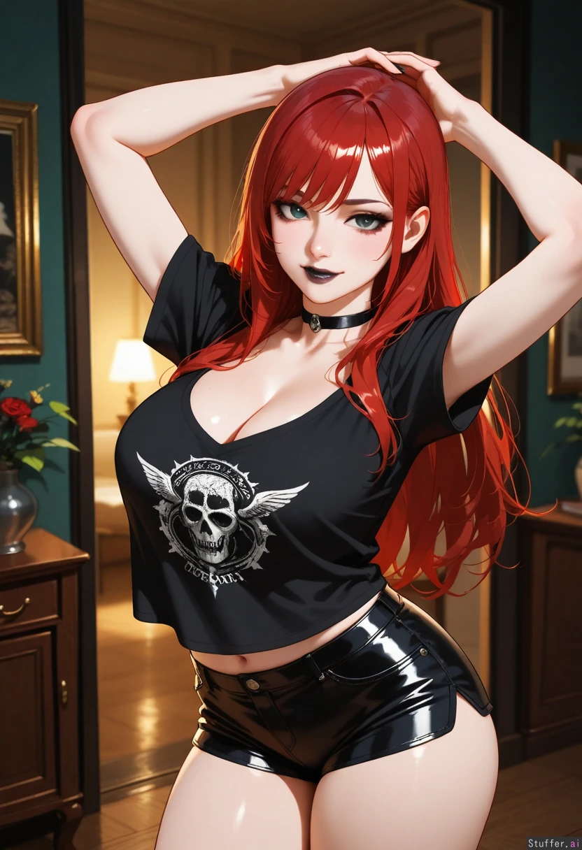(exquisite quality, extremely detailed, realistic anime style, masterpiece, absurdres, solo, one girl). A sexy goth girl flirting with viewer. Dancing, hands over her head. At a party. Wearing a black t-shirt with deep cleavage. Wearing black leather short-shorts. Goth outfit. (Goth makeup, black lips, black eyeliner). Hedonistic. 30 years old. Beautiful long red hair, beautiful dark-green eyes. Bewitching beauty. Cheerful house party, living-room background. (Chubby)