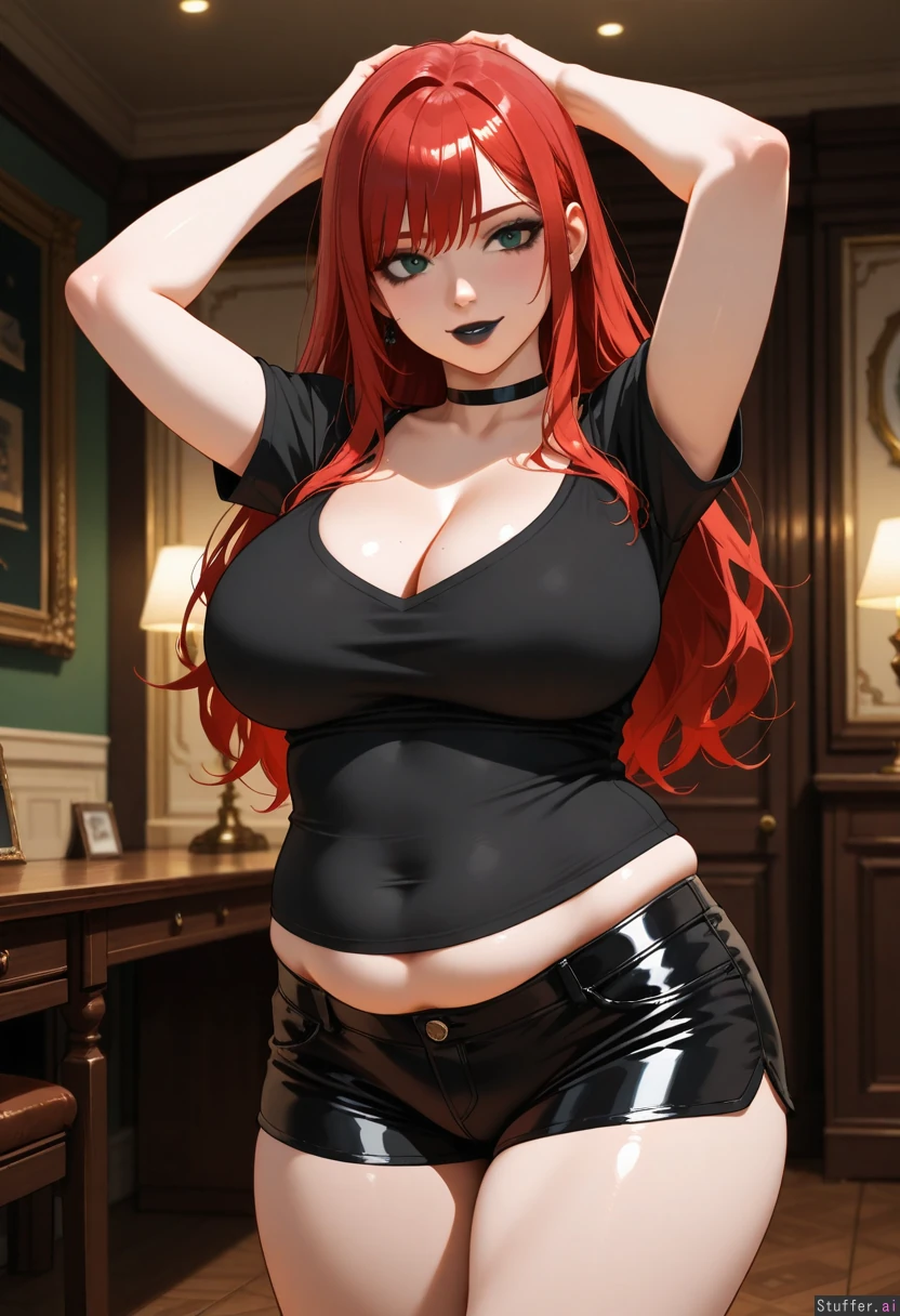 (exquisite quality, extremely detailed, realistic anime style, masterpiece, absurdres, solo, one girl). A sexy goth girl flirting with viewer. Dancing, hands over her head. At a party. Wearing a black t-shirt with deep cleavage. Wearing black leather short-shorts. Goth outfit. (Goth makeup, black lips, black eyeliner). Hedonistic. 30 years old. Beautiful long red hair, beautiful dark-green eyes. Bewitching beauty. Cheerful house party, living-room background. (Chubby, smooth spherical fat belly bulge, belly peek)