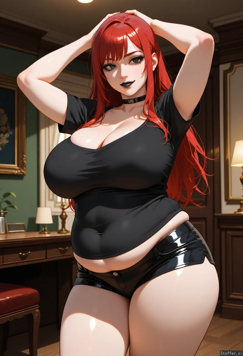 (exquisite quality, extremely detailed, realistic anime style, masterpiece, absurdres, solo, one girl). A sexy goth girl flirting with viewer. Dancing, hands over her head. At a party. Wearing a black t-shirt with deep cleavage. Wearing black leather short-shorts. Goth outfit. (Goth makeup, black lips, black eyeliner). Hedonistic. 30 years old. Beautiful long red hair, beautiful dark-green eyes. Bewitching beauty. Cheerful house party, living-room background. (Chubby, round huge fat belly bulge, belly peek)