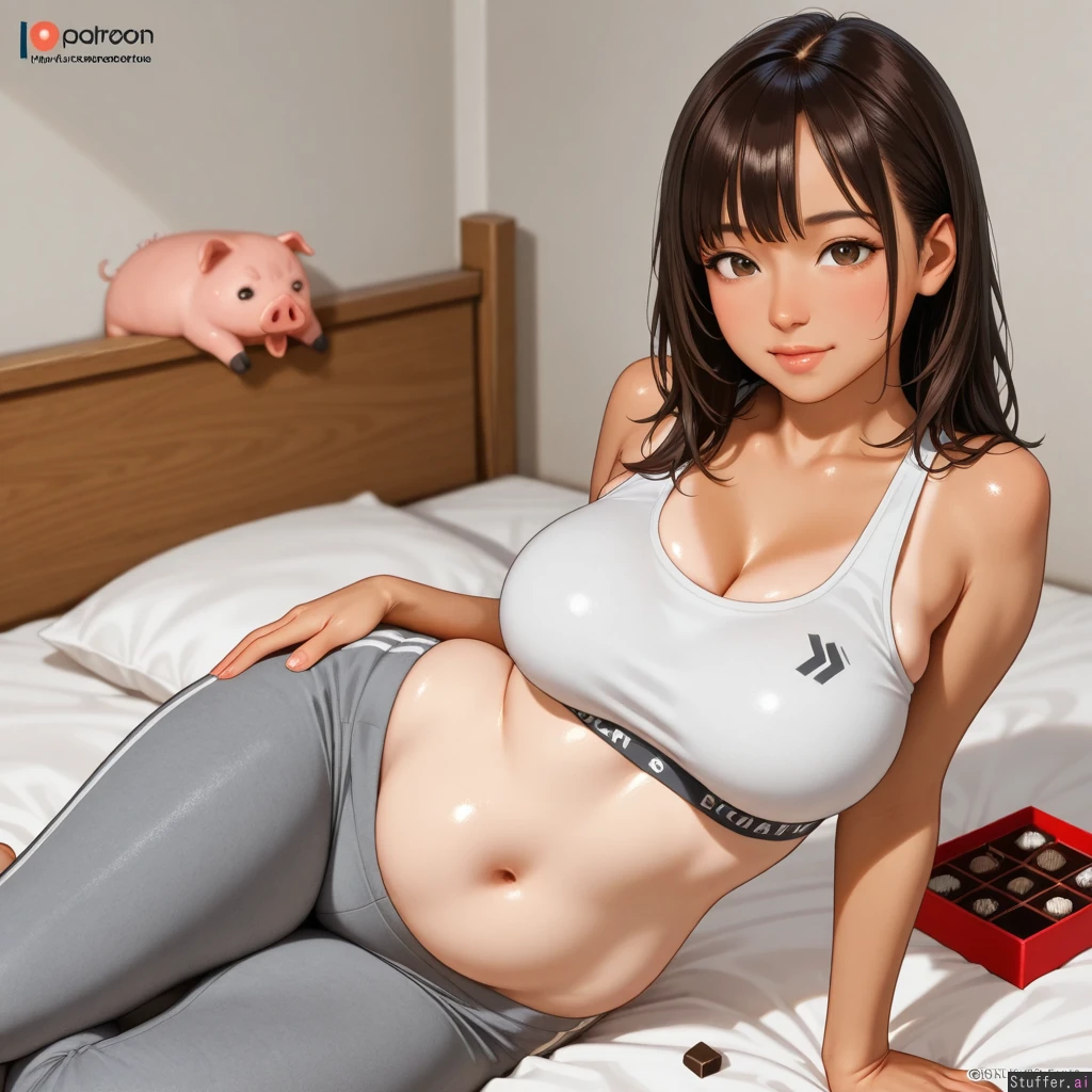 Very bottom heavy curvy american sexy supermodel indulges herself with a box of chocolates while laying in her lavish bedroom. 25 years old. Luscious brunette hair. Tanned sun-kissed skin. Wearing tight grey Sweatpants and an overflowing white sports bra. Rapid weight gain . Getting fat. Plump. Bbw. Beautiful pampered belly. Stuffing herself like a pig at a farm (Photorealistic) (Goddess) (Top rated) (Masterpiece)