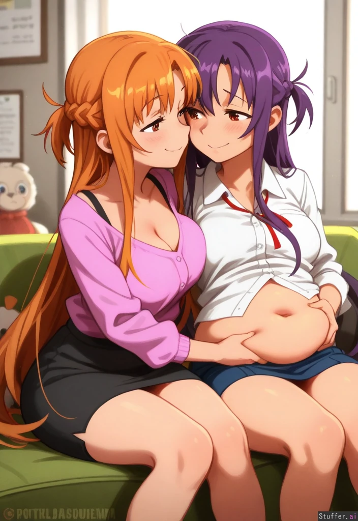 khyle.(artist),2 girls, anime, (two girls),(showing their belly's),(clothes opened),office clothes,(belly, curvy, potbelly),round ass, cleavage, (sitting and touching),(stuffed bellies, bloated),(flirting), (belly overhang),((handjob and belly_grab)), ((Asuna SAO and Akame agk))