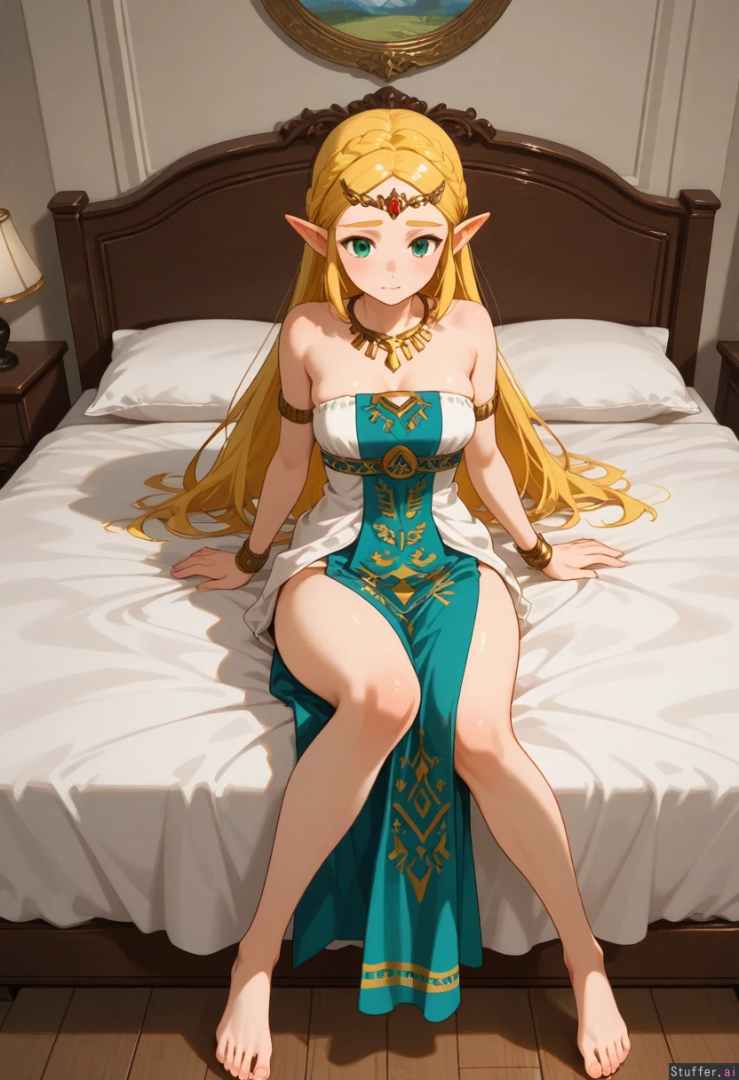 Princess Zelda on her bed (huge_breasts:0.1), (weight_gain:0.1), full_body