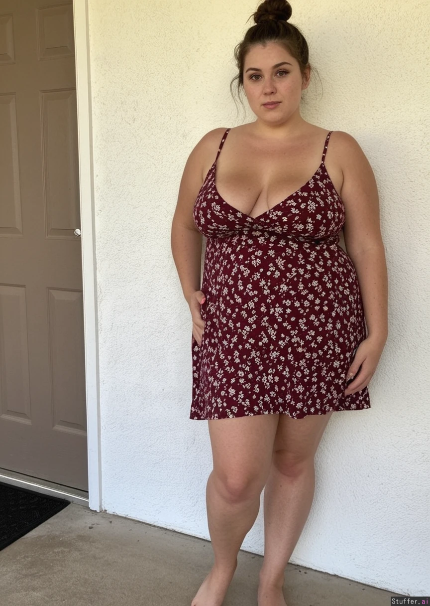 beautiful meaty wife, brunette, messy updo, bare feet, thin legs, narrow waist, doughy belly, large shoulders, chubby arms, perky tits, standing, high resolution image, burgundy floral short summer dress, exterior white wall (skinny:1.0) (morbidly obese:0.0)