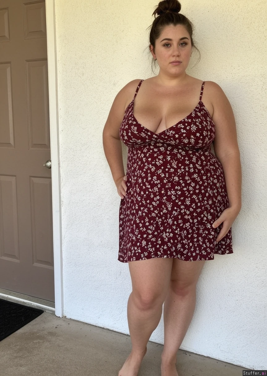 beautiful meaty wife, brunette, messy updo, bare feet, thin legs, narrow waist, doughy belly, large shoulders, chubby arms, perky tits, standing, high resolution image, burgundy floral short summer dress, exterior white wall (skinny:0.0) (morbidly obese:0.0)