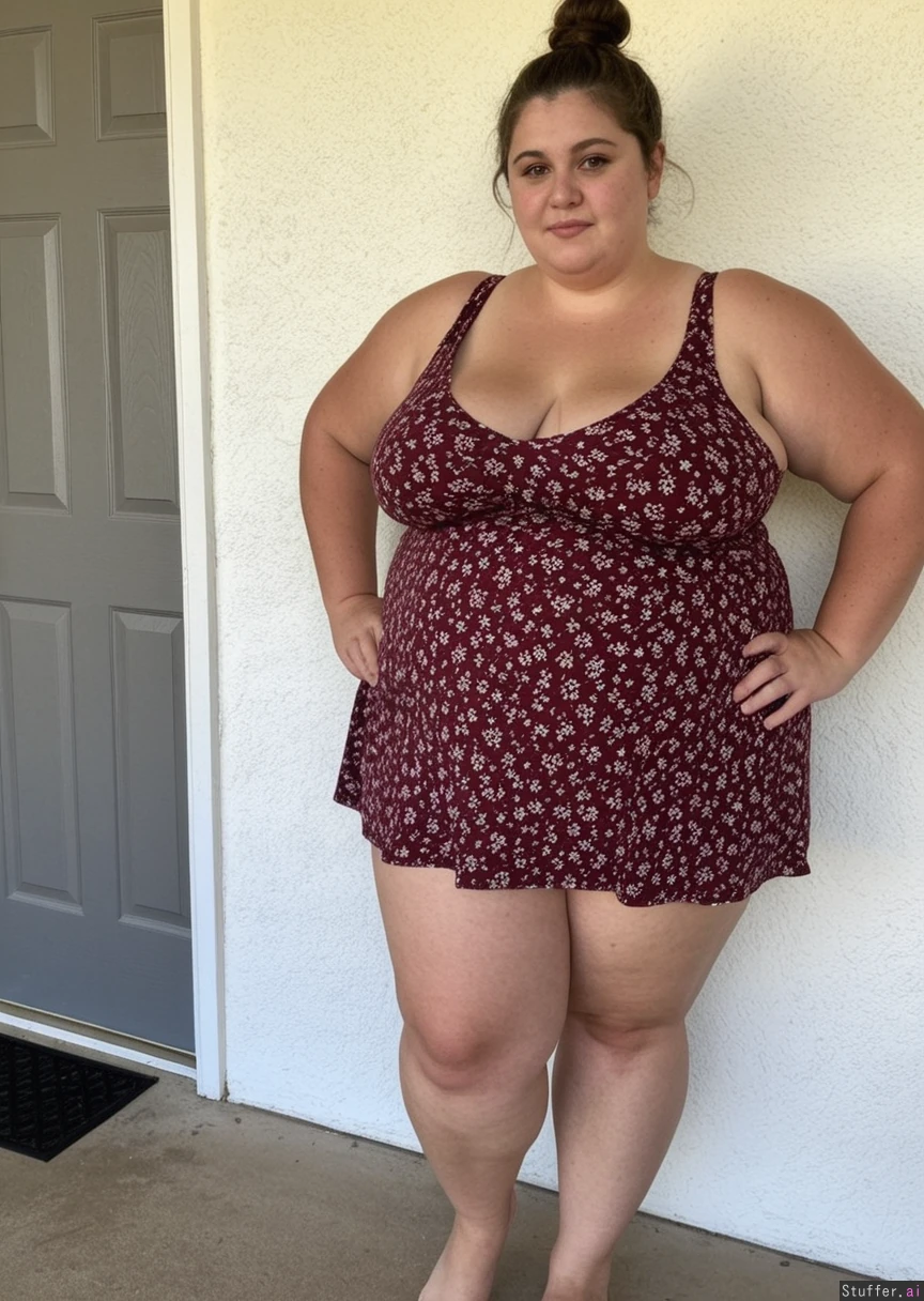 beautiful meaty wife, brunette, messy updo, bare feet, thin legs, narrow waist, doughy belly, large shoulders, chubby arms, perky tits, standing, high resolution image, burgundy floral short summer dress, exterior white wall (skinny:0.0) (morbidly obese:1.25)