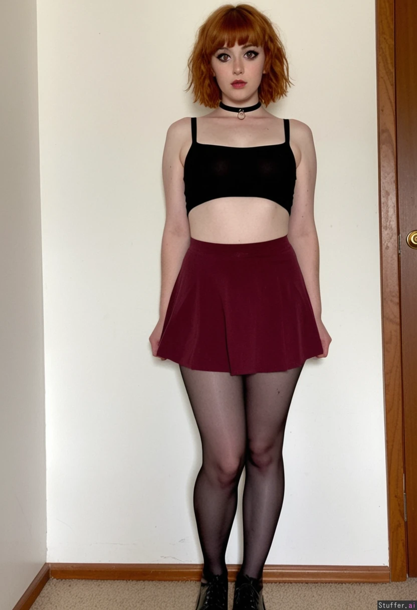 beautiful meaty girlfriend, ginger, messy hair with short bangs, skinny legs, narrow waist, doughy belly, large shoulders, chubby arms, perky small tits, standing, high resolution image, white walls, pale skin, wearing dr. martens, pantyhose, short burgundy skirt, black croptop, choker, eyeliner (skinny:1.1) (morbidly obese:0.0)