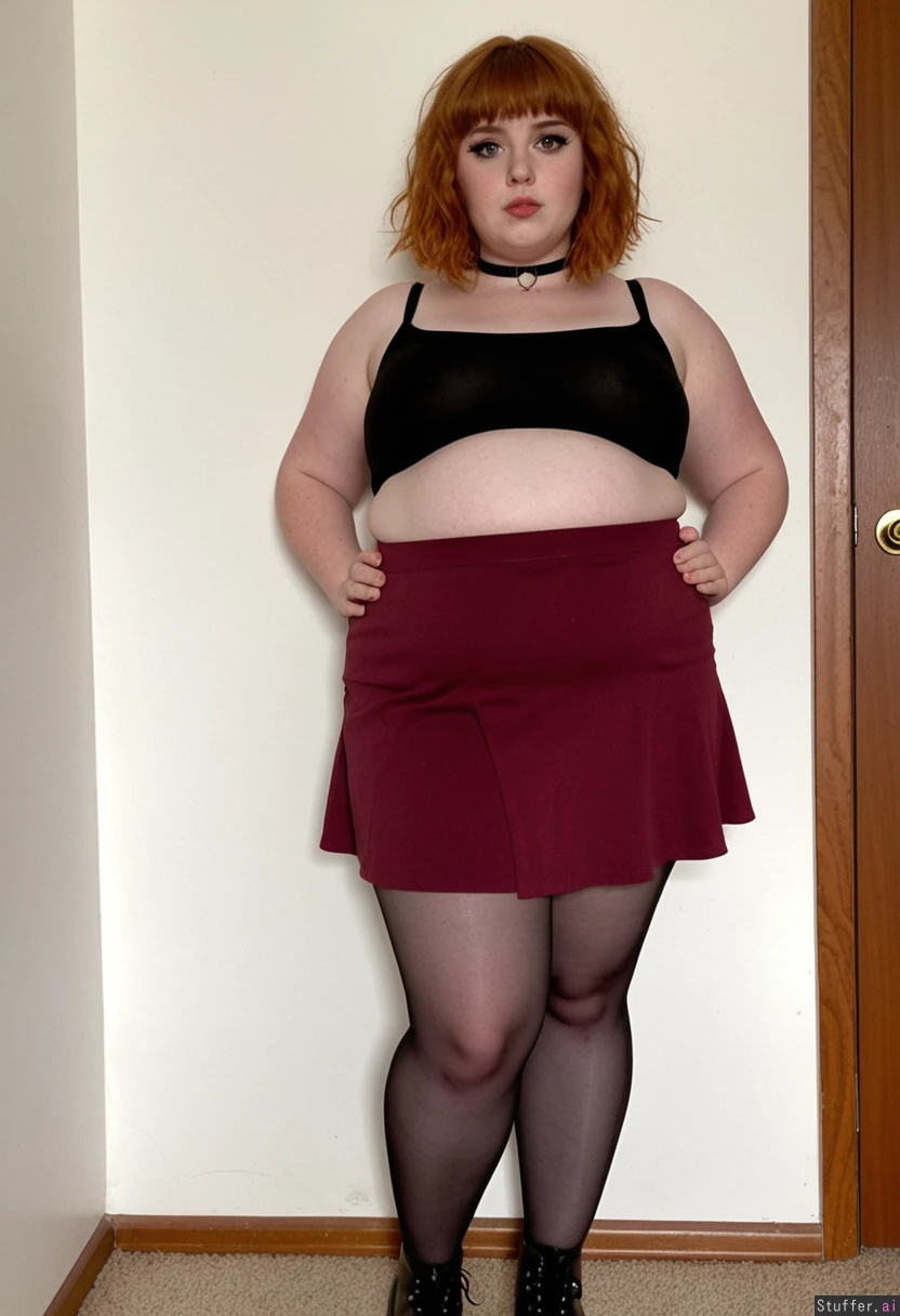 beautiful meaty girlfriend, ginger, messy hair with short bangs, skinny legs, narrow waist, doughy belly, large shoulders, chubby arms, perky small tits, standing, high resolution image, white walls, pale skin, wearing dr. martens, pantyhose, short burgundy skirt, black croptop, choker, eyeliner (skinny:0.0) (morbidly obese:1.1)