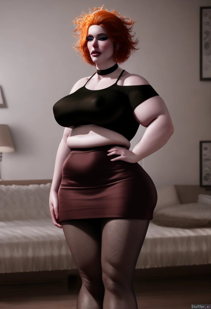 best quality, high rating, beautiful meaty girlfriend, ginger, messy hair with short bangs, skinny legs, narrow waist, doughy belly, large shoulders, chubby arms, perky small tits, standing, high resolution image, white walls, pale skin, wearing dr. martens, pantyhose, short burgundy skirt, black croptop, choker, eyeliner (skinny:0.0) (morbidly obese:0.0)