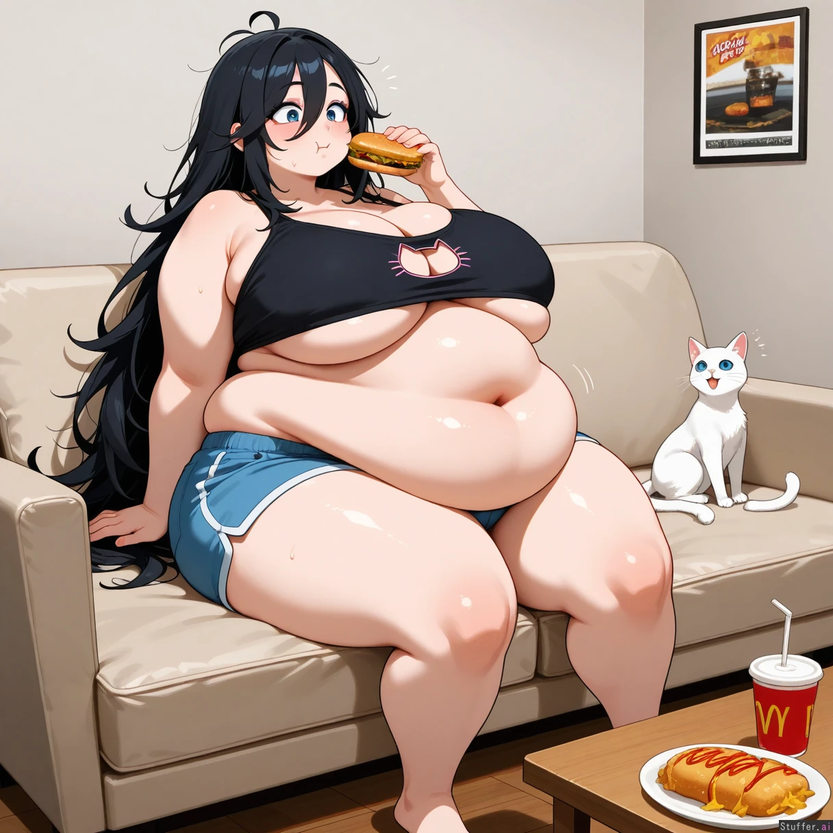 1 girl, solo, very long hair, hair_over_one_eye, messy black hair, blue eyes, eyeshadow, white cat_cutout top, blue shorts, barefoot,black bra, black underwear, big_breasts, obese, fat belly, eating food, sitting on couch, fast food stacked on table,weight gain, belly_expansion, wide hips, horny, excited, gluttonous, likes to get fatter, slob, self groping, underboob