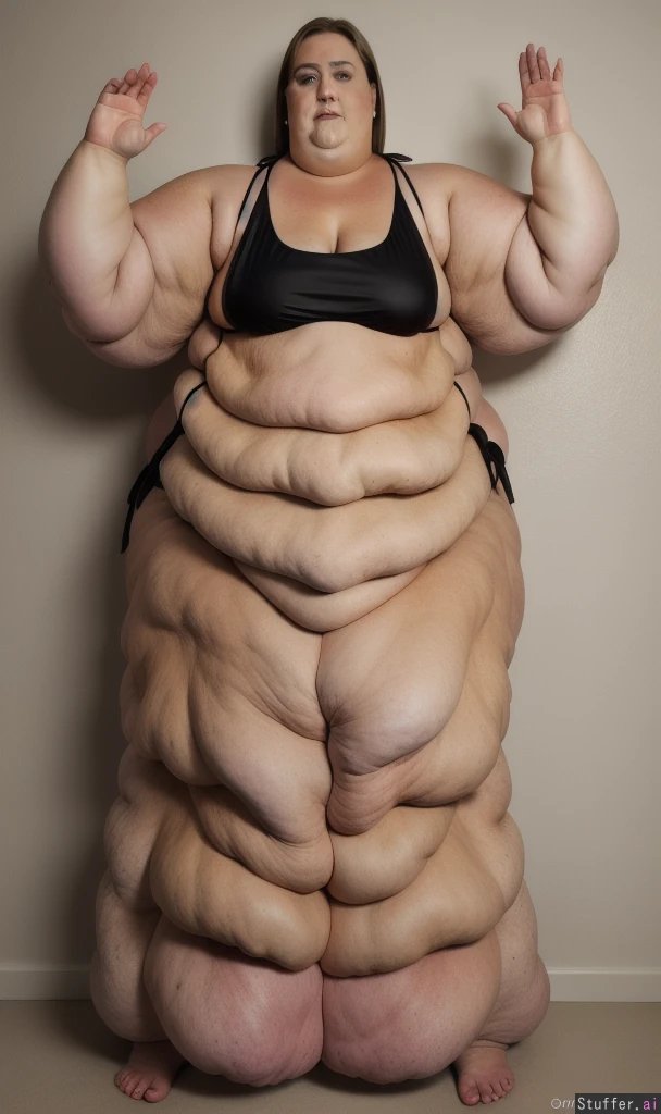 Photo realistic, highly detailed, realistic lighting, blonde ssbbw, standing, beautiful face, brown hair:1.4, (wearing a black bikini:1.4) , double chin:1.8, (fat face:1.8), ultra huge arms:1.9), (ultra huge legs:1.9), (ultra leg rolls:1.7), (ultra huge calves:1.8), (cellulite:1.5), ultra fat ankles:1.8), bare feet:1.4