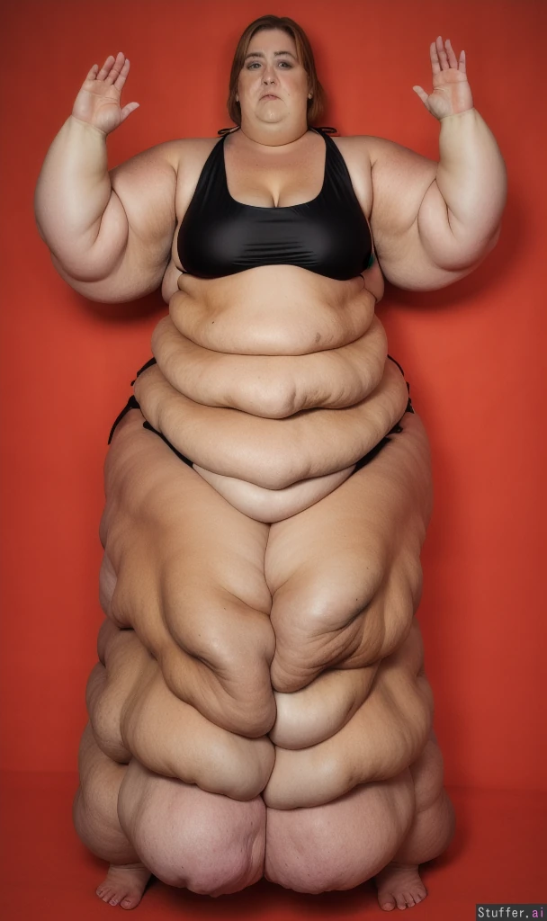 Photo realistic, highly detailed, realistic lighting, blonde ssbbw, standing, beautiful face, brown hair:1.4, (wearing a black bikini:1.4) , double chin:1.8, (fat face:1.8), ultra huge arms:1.9), (ultra huge legs:1.9), (ultra leg rolls:1.7), (ultra huge calves:1.8), (cellulite:1.5), ultra fat ankles:1.8), bare feet:1.4