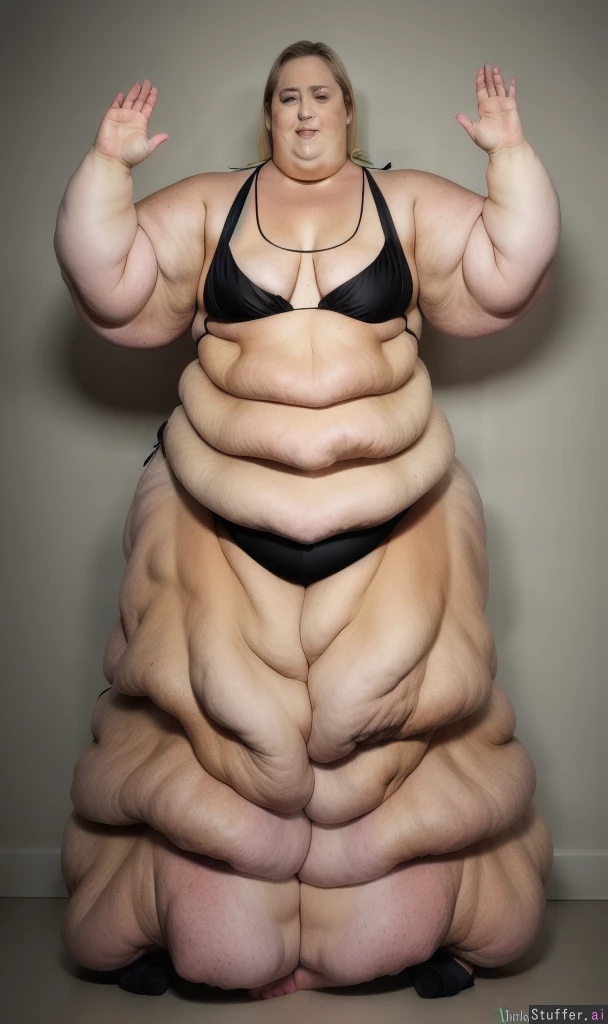 Photo realistic, highly detailed, realistic lighting, blonde ssbbw, standing, beautiful face, (wearing a black bikini:1.4) , (ultra double chin:1.8), (ultra fat face:1.8), ultra huge arms:1.9), (ultra huge legs:1.9), (ultra leg rolls:1.7), (ultra huge calves:1.8), (cellulite:1.5), ultra fat ankles:1.8), bare feet:1.4