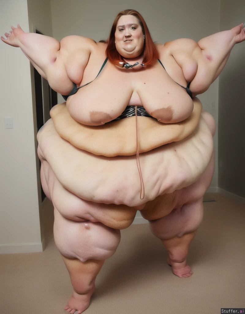 Photo realistic, ultra high quality, red head ssbbw, beautiful face:1.4, (ultra double chin:1.9), (ultra fat face:1.9), (ultra huge legs:1.9), (ultra huge arms:1.9), (ultra leg rolls:1.7), bare feet:1.4, naked:1.4, taking a selfie