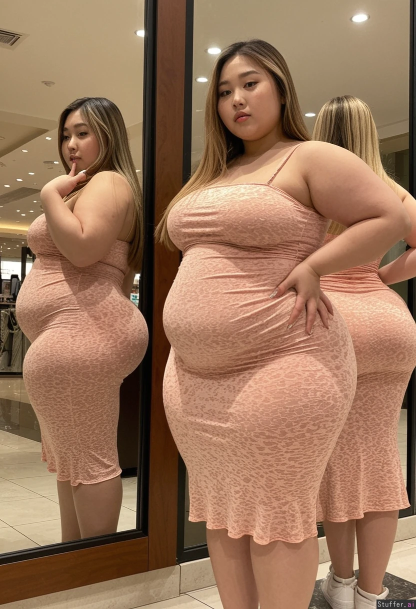 20 year old beautiful model Korean girl, hair dyed with blonde highlights (((wearing big stretchy summer dress)))