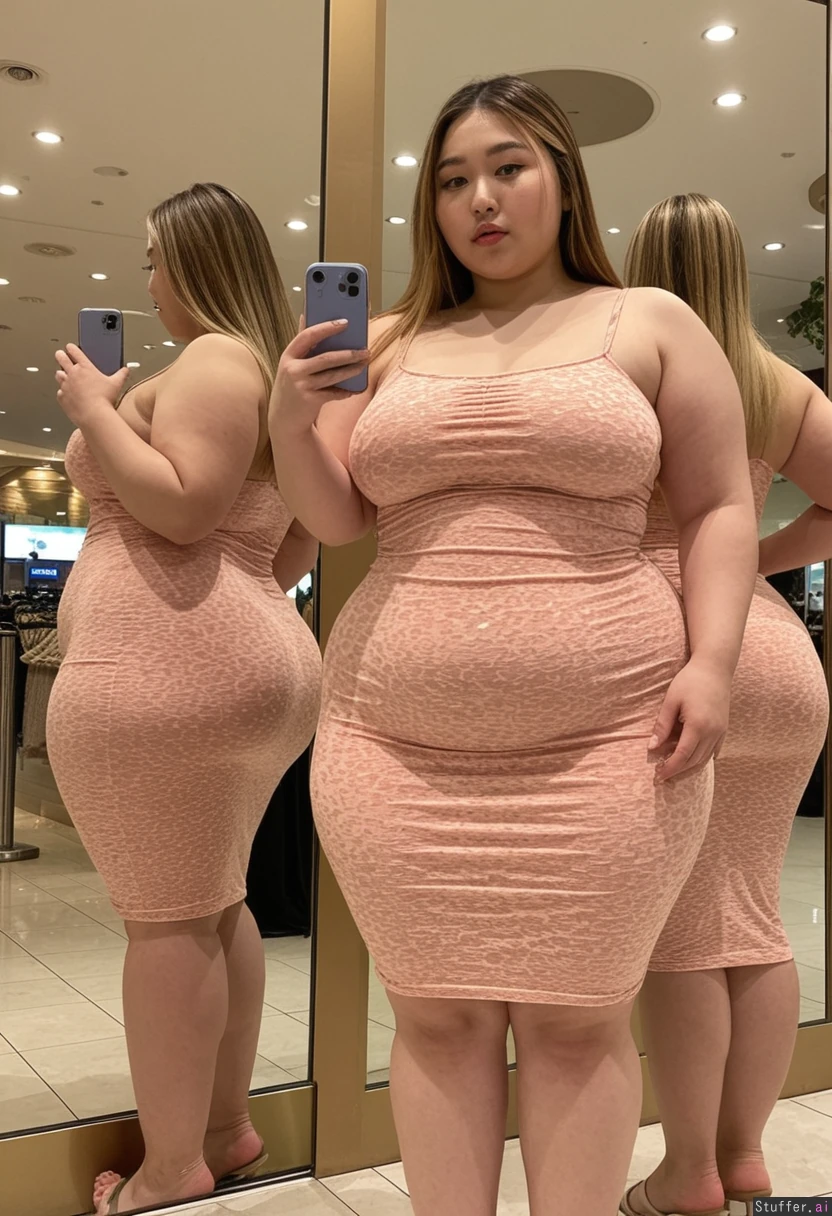 20 year old beautiful model Korean girl, hair dyed with blonde highlights (((wearing big stretchy summer dress)))