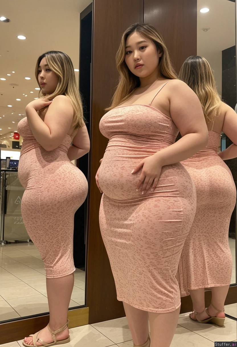 20 year old beautiful model Korean girl, hair dyed with blonde highlights (((wearing big stretchy summer dress)))