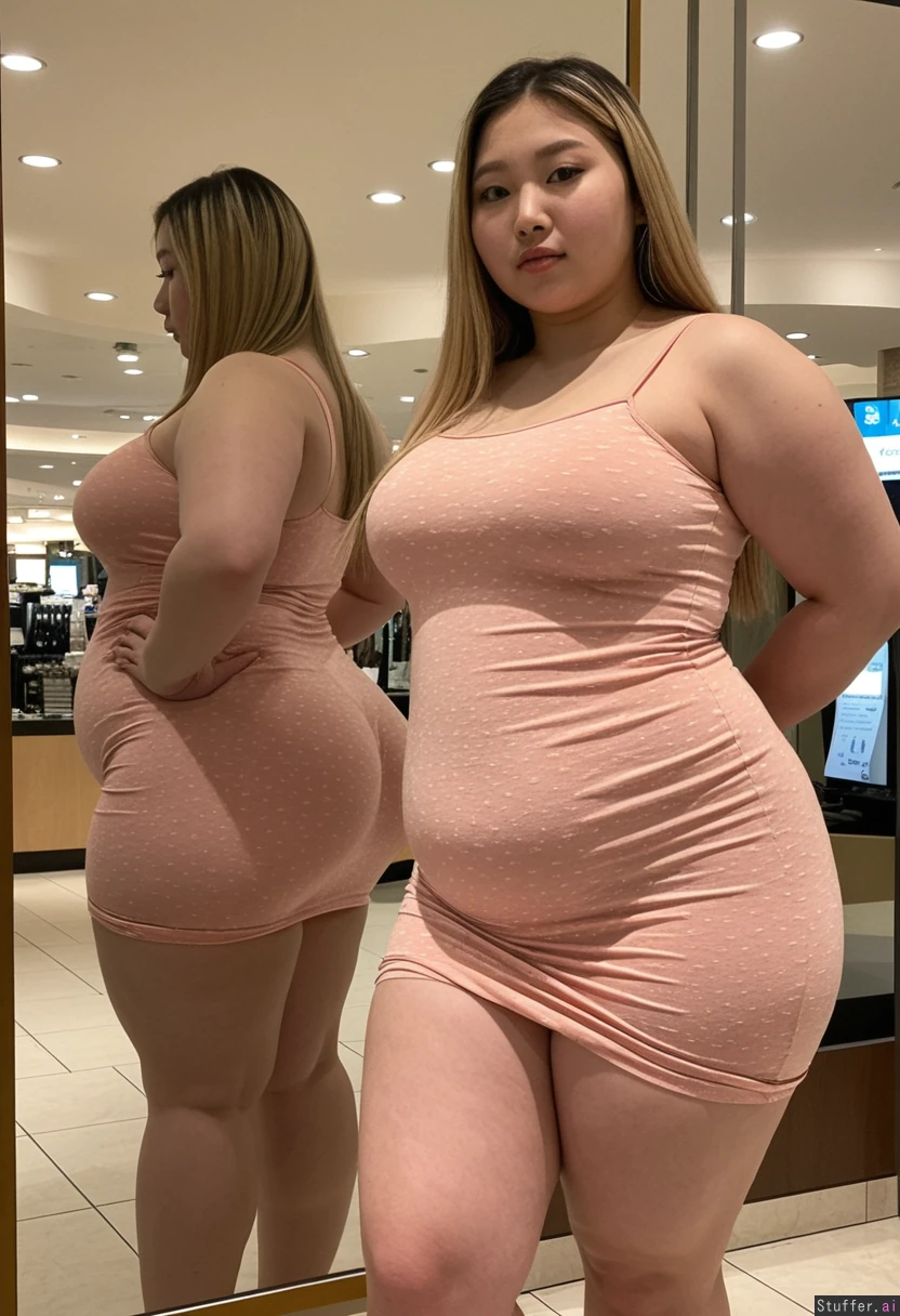 20 year old beautiful Korean girl, hair dyed with blonde highlights (((wearing big stretchy summer dress)))