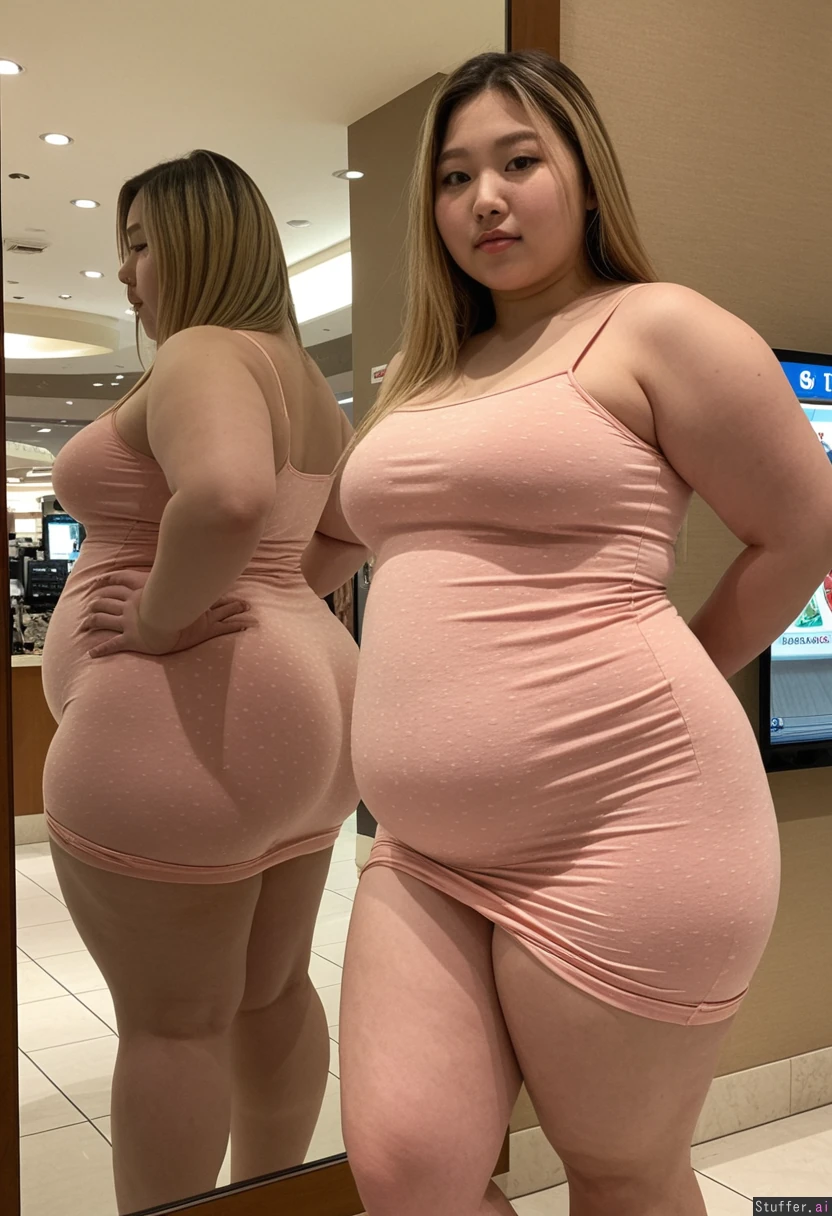 20 year old beautiful Korean girl, hair dyed with blonde highlights (((wearing big stretchy summer dress))) (((Wide hips))) Big soft belly Fat_belly:1.0 (Plump) ((Chubby belly)) (Soft belly) Full body view Beautiful lighting Standing in mall, in front of mirror