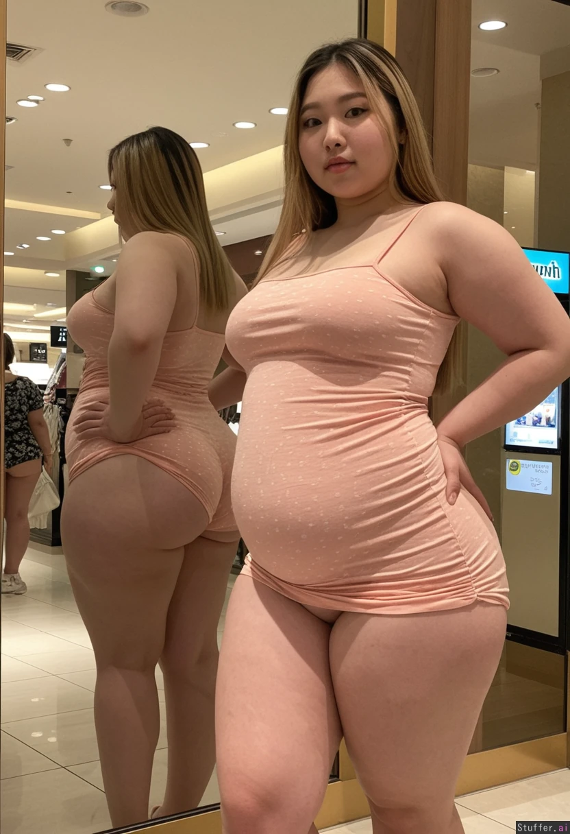 20 year old beautiful Korean girl, hair dyed with blonde highlights (((wearing big stretchy summer dress))) (((Wide hips))) Fat Big soft belly (Fat_belly:1.0) (Plump) (Chubby belly) ((Soft belly)) Full body view Beautiful lighting Standing in mall, in front of mirror