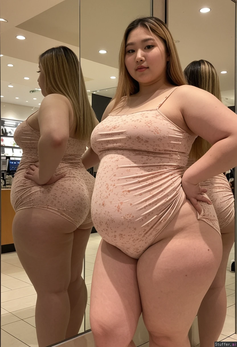 20 year old beautiful Korean girl, hair dyed with blonde highlights (((wearing big stretchy summer dress))) (((Wide hips))) Obese Fat Big soft belly (Fat_belly:1.0) (Plump) (Chubby belly) ((Soft belly)) Full body view Beautiful lighting Standing in mall, in front of mirror