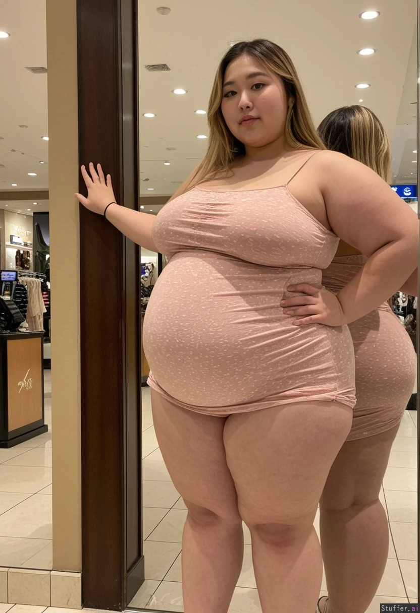 20 year old beautiful Korean girl, hair dyed with blonde highlights (((wearing big stretchy summer dress))) (((Wide hips))) ((Obese)) Fat Big soft belly (Fat_belly:1.0) ((Plump)) Chubby belly (Soft belly) Full body view Beautiful lighting Standing in mall, in front of mirror