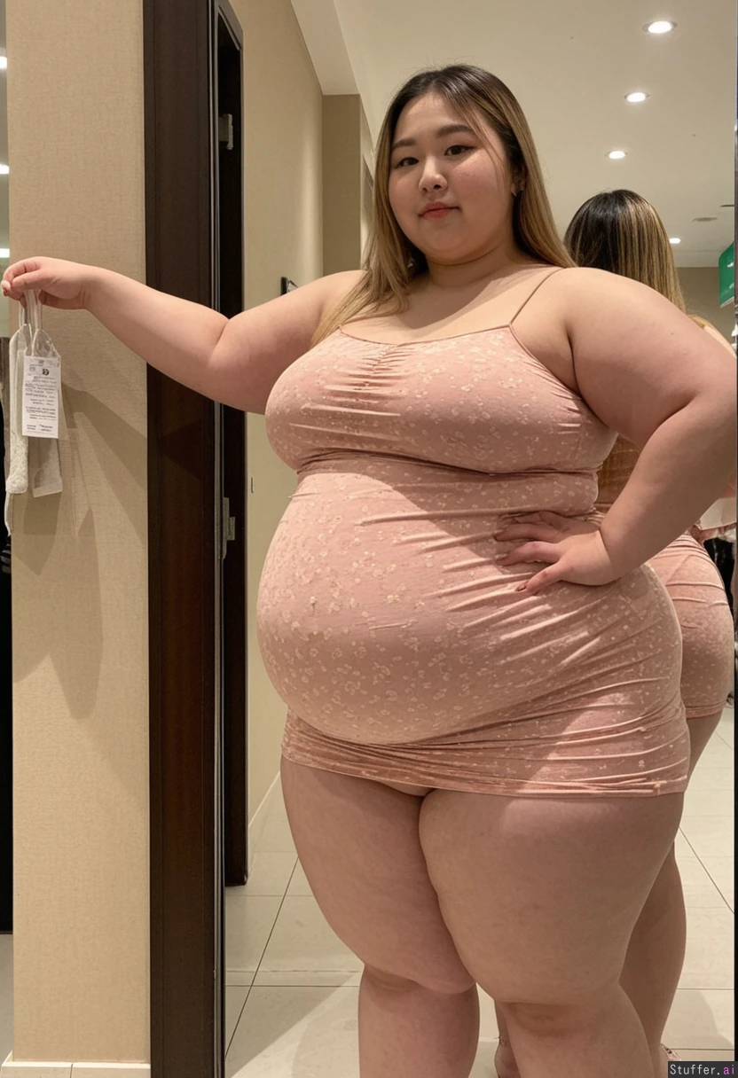 20 year old beautiful Korean girl, hair dyed with blonde highlights (((wearing big stretchy summer dress))) (((Wide hips))) ((Obese)) Fat Big soft fat belly (Fat_belly:1.0) Chubby belly ((Plump)) (Soft belly) Full body view Beautiful lighting Standing in mall, in front of mirror