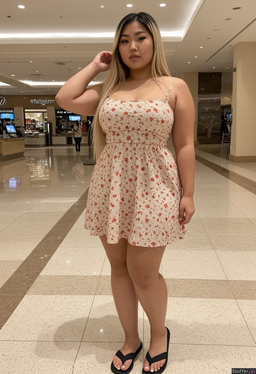 20 year old,(((Instagram model face))), (((baddie asian Instagram model))), hair dyed with blonde highlights (((wearing summer dress and flip flops)))