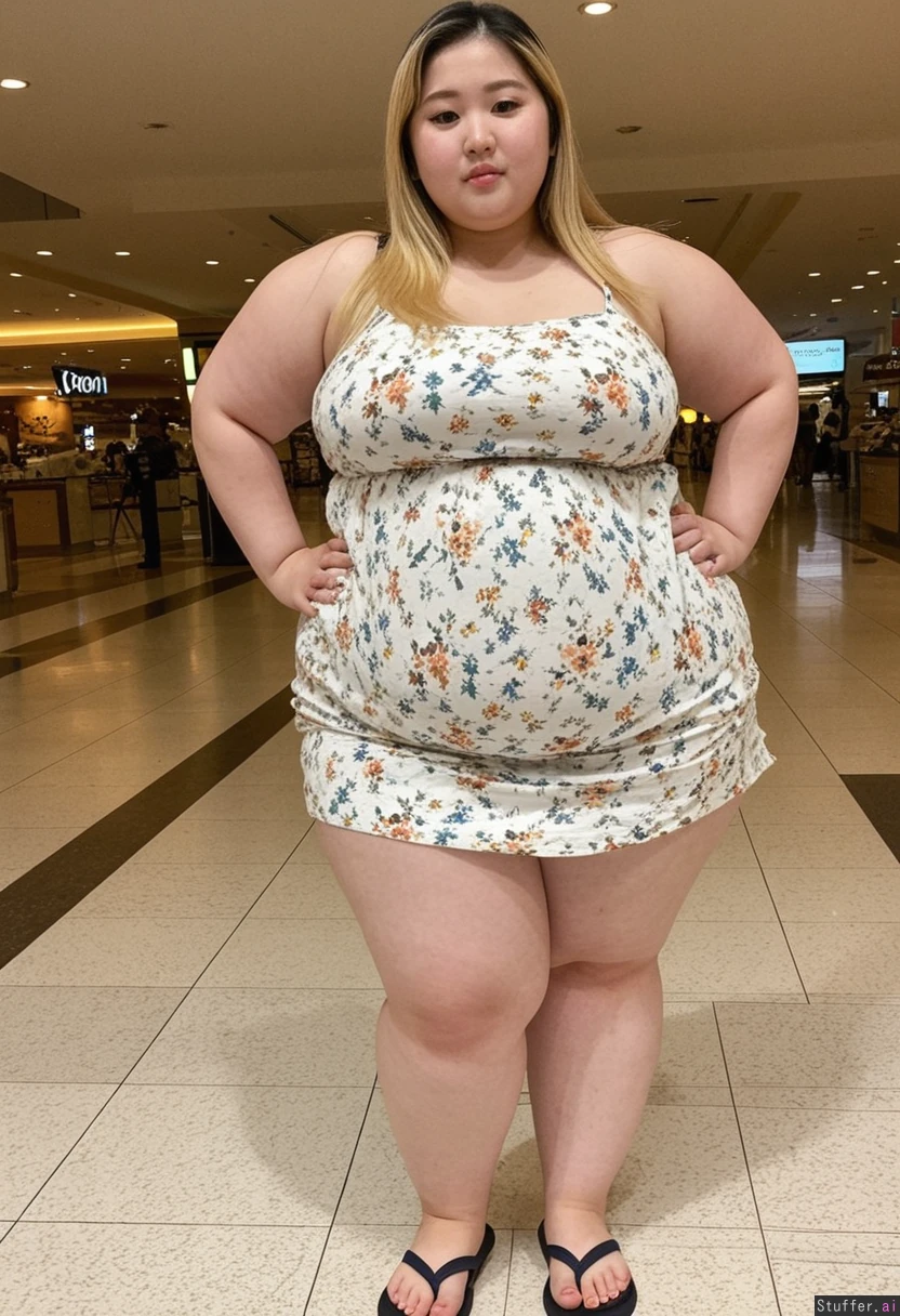 20 year old beautiful Korean girl, hair dyed with blonde highlights (((wearing summer dress and flip flops))) (((Wide hips))) Obese BBW Bottom heavy (Fat_belly:1.3) (Thick plump fat legs) Plump Full body view Beautiful lighting Standing in mall
