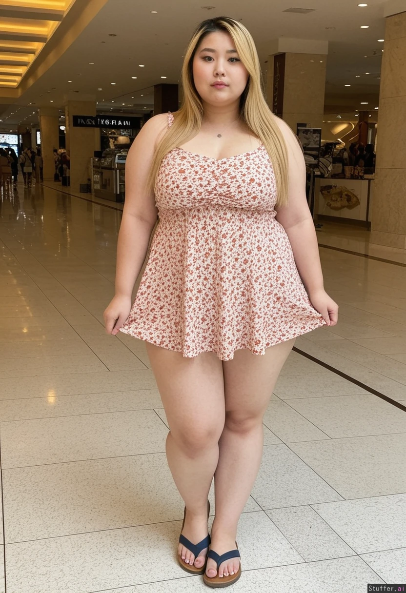 20 year old beautiful Korean girl, hair dyed with blonde highlights (((instagram model face)))(((wearing summer dress and flip flops))) (((Wide hips))) Obese Chubby Plump (Fat_belly:1.0) Full body view Beautiful lighting Standing in mall