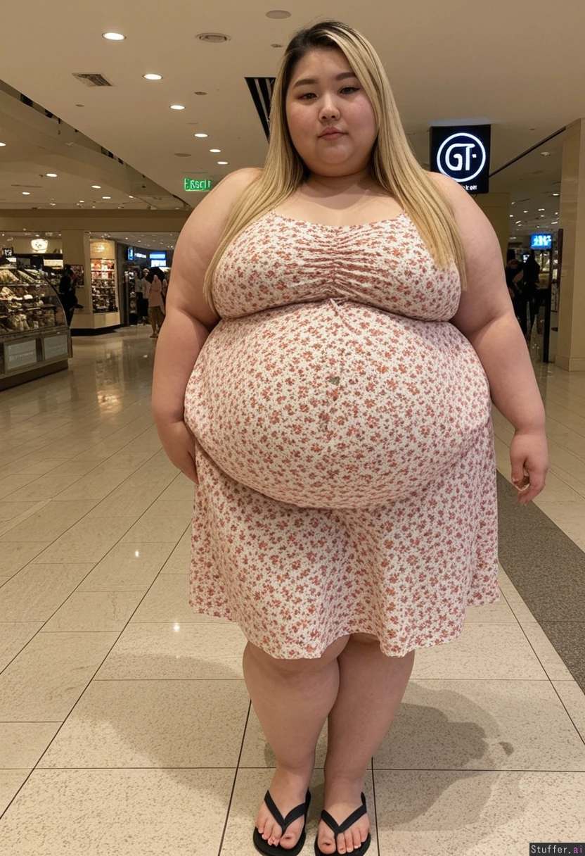 20 year old beautiful Korean girl, hair dyed with blonde highlights (((instagram model face)))(((wearing summer dress and flip flops))) (((Wide hips))) Obese Plump (Fat_belly:1.6) Full body view Beautiful lighting Standing in mall