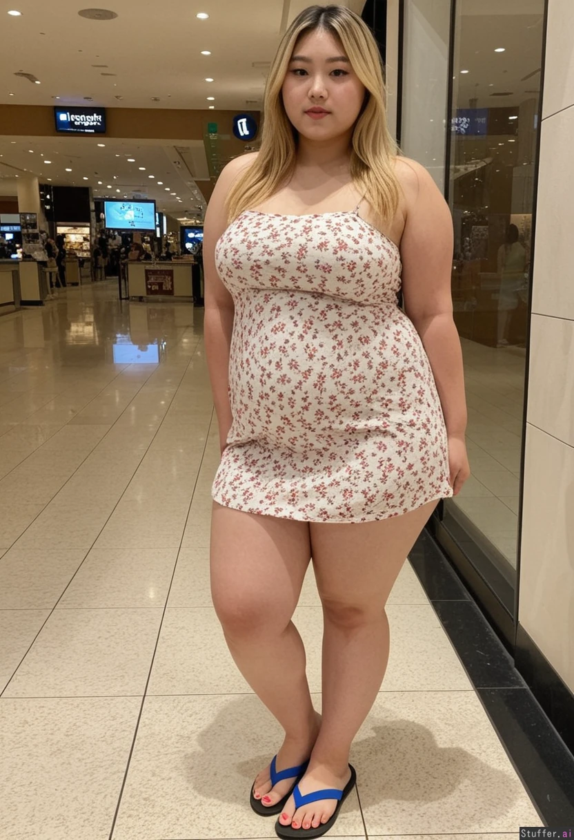 20 year old beautiful Korean girl, hair dyed with blonde highlights (((instagram model face)))(((wearing summer dress and flip flops))) (((Wide hips))) Obese Plump (Fat_belly:1.3) Full body view Beautiful lighting Standing in mall