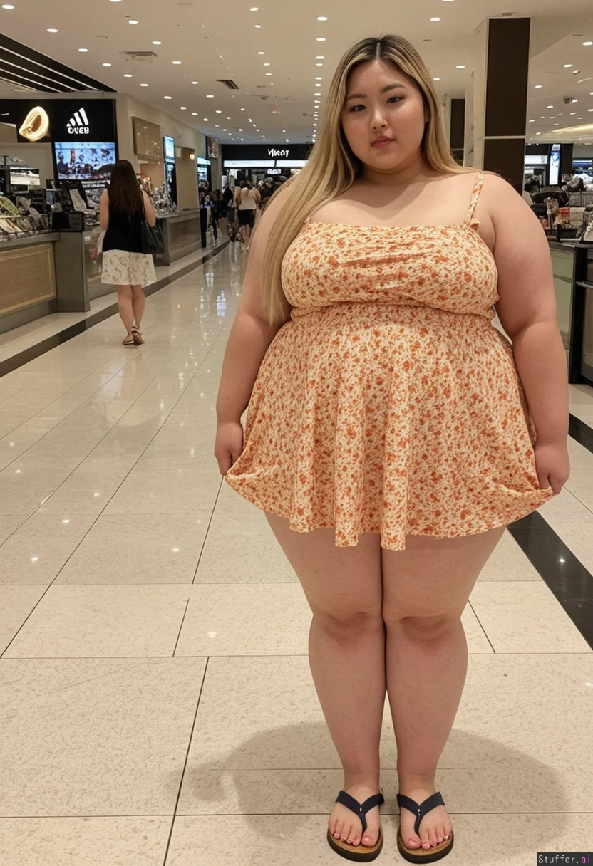 20 year old beautiful Korean girl, hair dyed with blonde highlights (((instagram model face)))(((wearing summer dress and flip flops))) (((Wide hips))) Obese SSBBW Plump (Fat_belly:1.3) Full body view Beautiful lighting Standing in mall