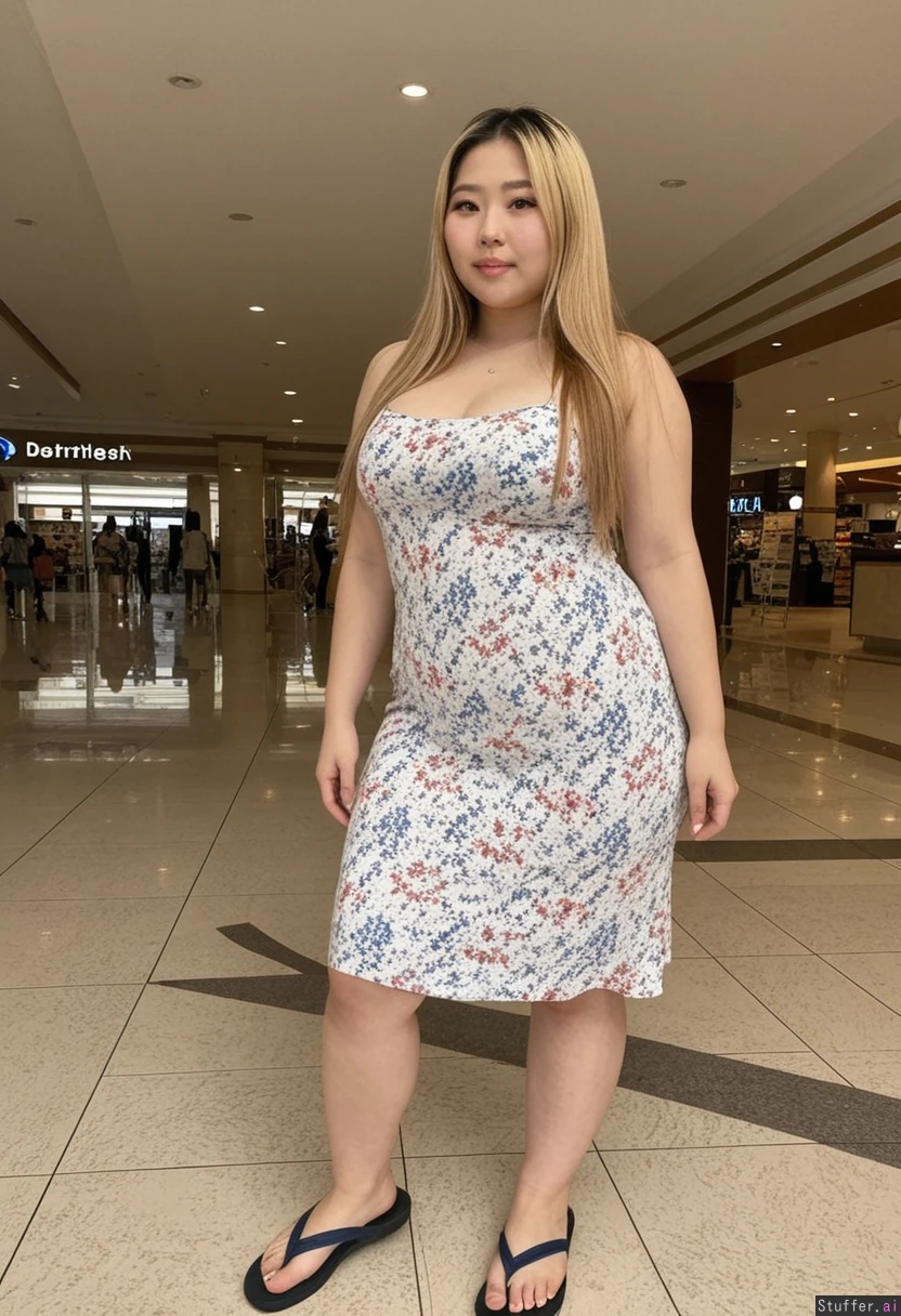 25 year old beautiful Korean girl, hair dyed with blonde highlights (((wearing summer dress and flip flops))) (((Wide hips))) Plump Full body view Beautiful lighting Standing in mall