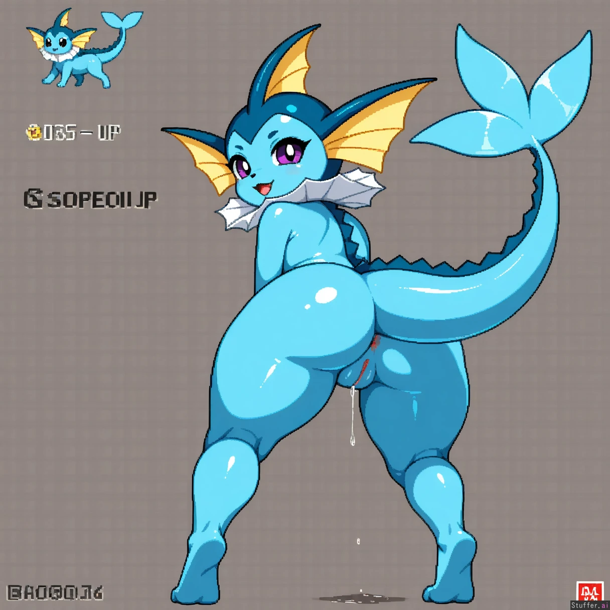 score_9, score_8_up, score_7_up, rating_explicit, pixel art, heavily pixelated, pokemon gold and silver style, vintage, pokemon sprite 1girl, vaporeon, feral, happy, thick thighs, rear view, tail up, presenting, pussy juice, looking back, full body, simple background, looking at viewer