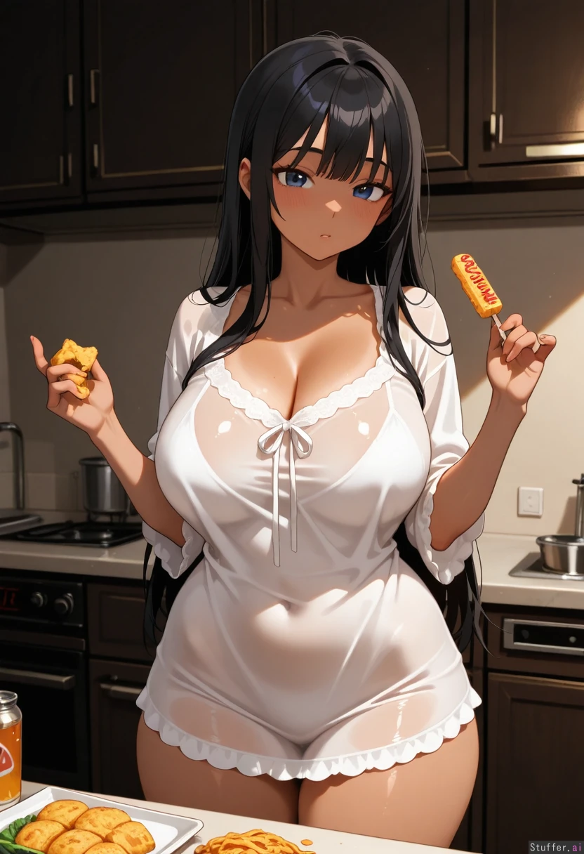Thick tan skin asian with long black hair, bangs and fringe. thick hips Scene: dark lighting, late night snack in kitchen, food in hand. Clothes: tight see-through nightwear cut-off at thighs Modifier: (thick_hips:0.8) (Huge_cleavage:0.5) (thick_ass:0.4) (soft_belly:0.2)