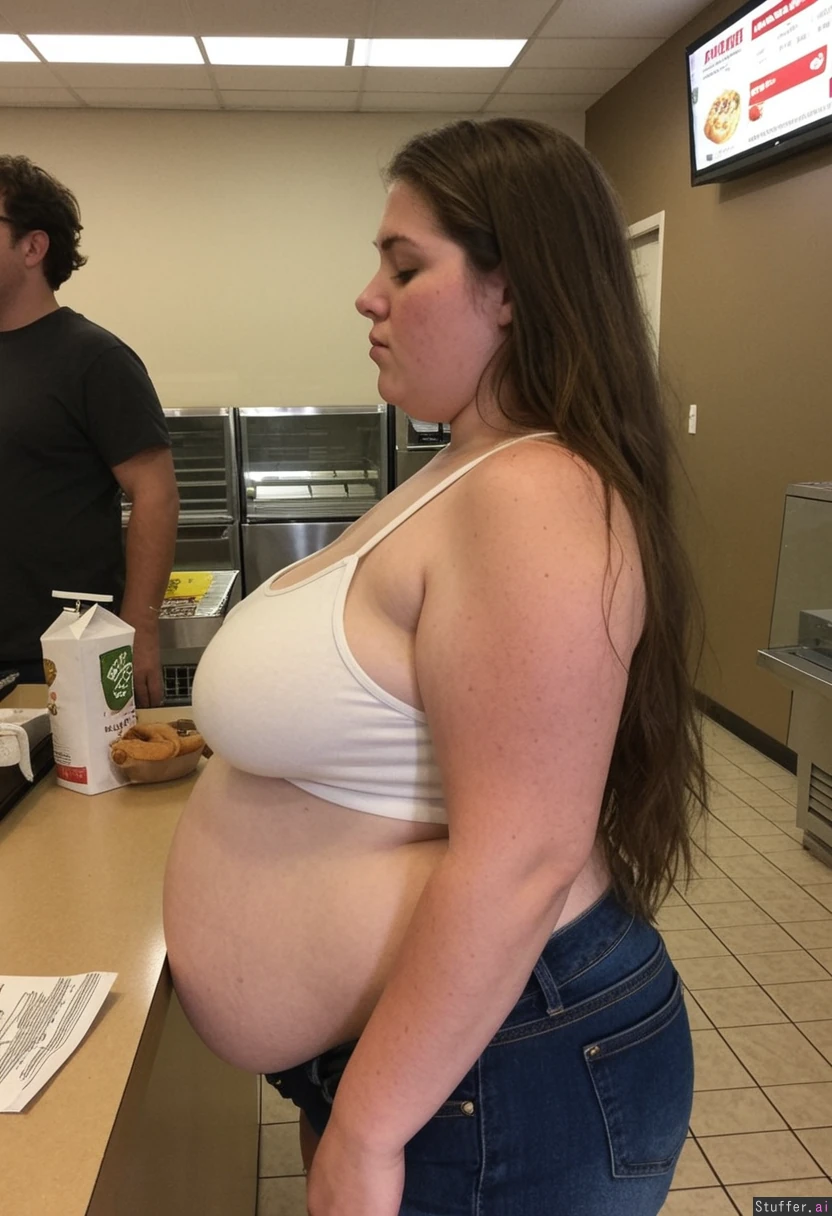 25 year old overfed local bumpkin chick, brunette, post pregnancy weight, round bloated face, ugly, double chin, messy unwashed long flowing hair, side view. She is wearing a stretchy white crop top tucked into her oversized ill-fitting denim shorts as she is just chubby enough to overfill her clothes. She is out of shape & she knows she's overweight & is trying to hide her belly & exhaustion, sweaty. Standing in a fast food restaurant scoffing donuts.