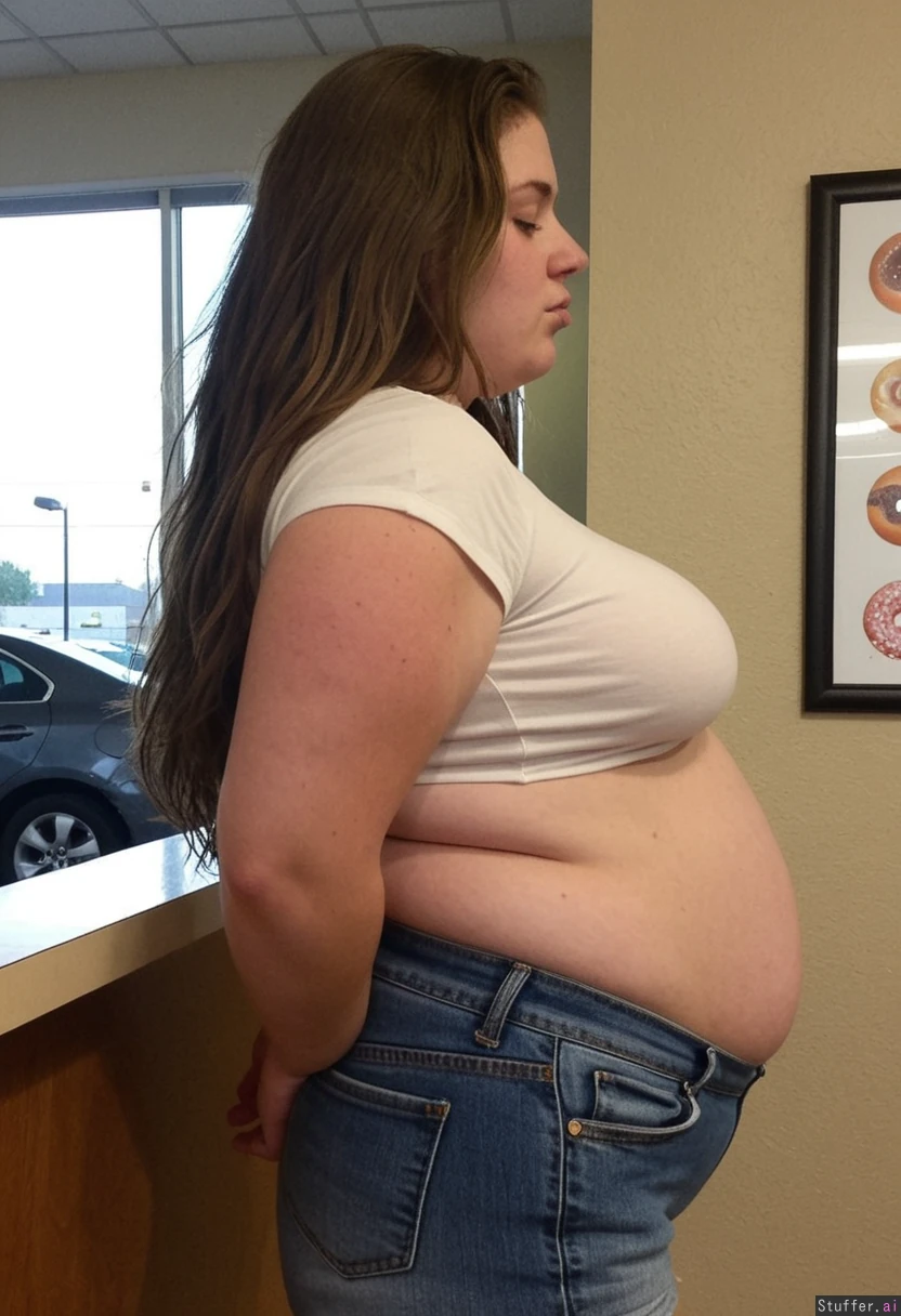 25 year old overfed local bumpkin chick, brunette, post pregnancy weight, round bloated face, ugly, double chin, messy unwashed long flowing hair, side view. She is wearing a stretchy white crop top tucked into her oversized ill-fitting denim shorts as she is just chubby enough to overfill her clothes. She is out of shape & she knows she's overweight & is trying to hide her belly & exhaustion, sweaty. Standing in a fast food restaurant scoffing donuts.