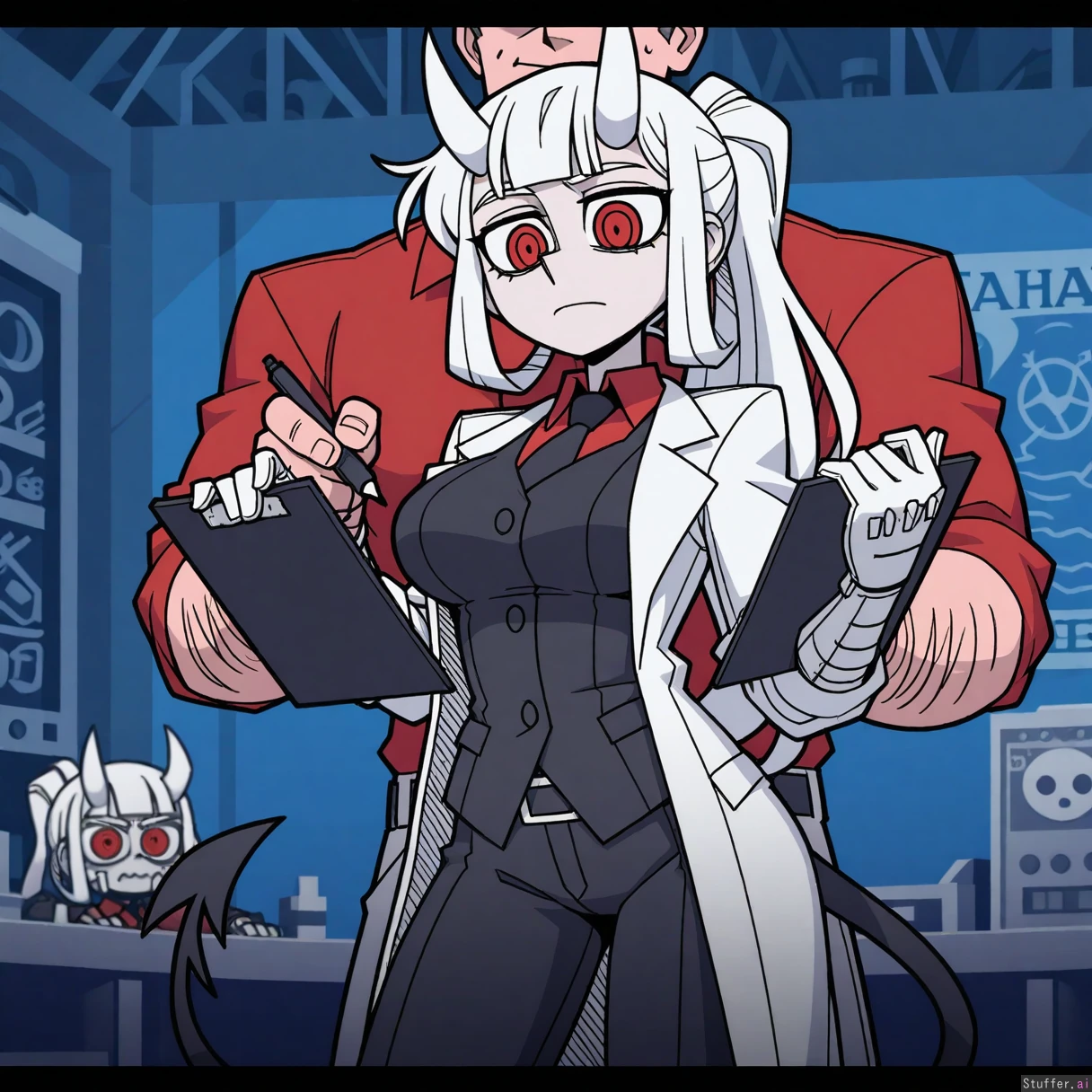 Best quality, amazing quality, absurd res, masterpiece, vanripper, 1girl, Loremaster \(helltaker\), laboratory background, holding clipboard and pen, standing, writing on clipboard 1boy, subject 67 (helltaker), behind female, bigger than female
