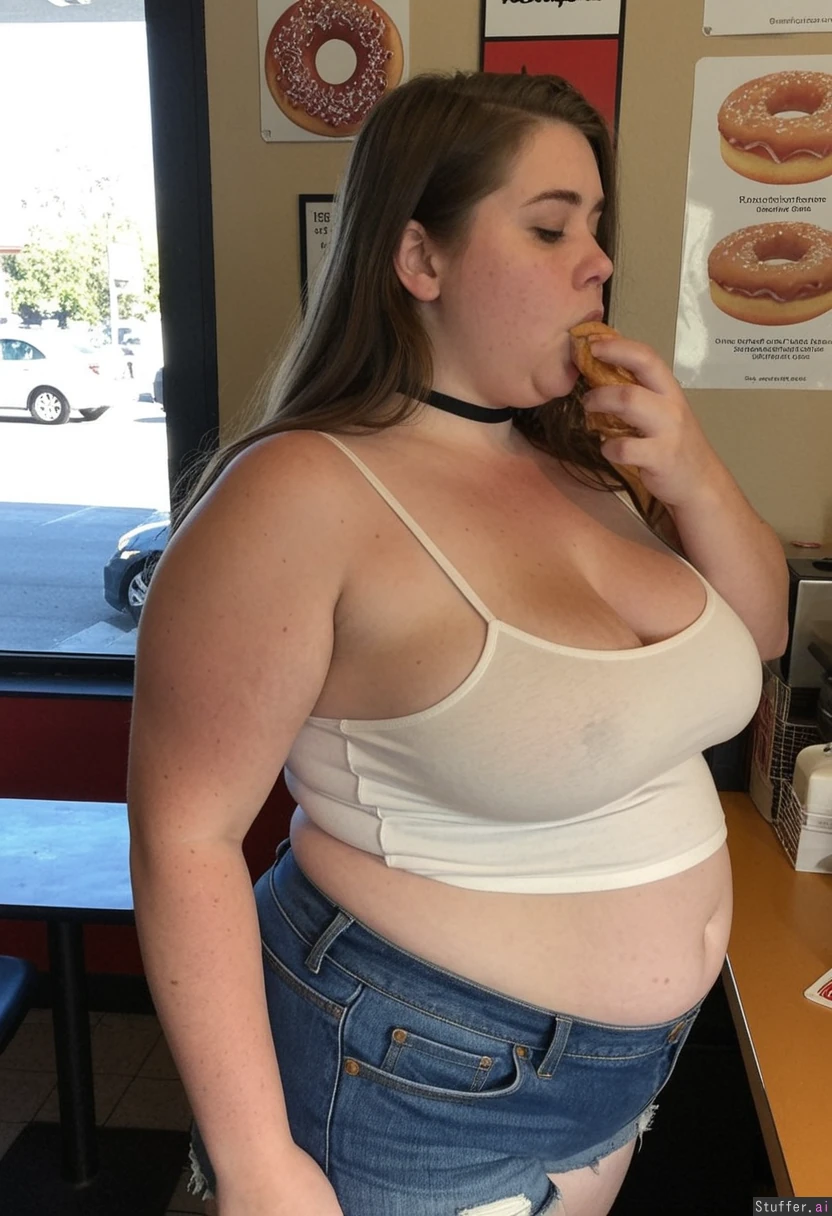 25 year old overfed local bumpkin chick, brunette, post pregnancy weight, round bloated face, ugly, unkempt, double chin, messy unwashed long flowing hair, front view slightly side on. She is extra short in height. She is wearing a tight choker, stretchy white backstrapped crop top tucked into her oversized ill-fitting denim shorts as she is just chubby enough to overfill her clothes. Her level of obesity is on the verge of giving her diabetes. Blob gut. Standing in a fast food restaurant scoffing donuts.
